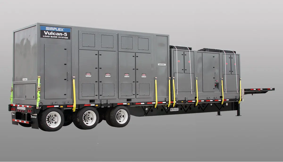 Very large capacity, portable Load Bank System consisting of multiple units, each rated 5.0MW, capable of parallel operation to form very large systems of up to virtually unlimited capacity. Medium voltage to 34.5kV. PLC-based digital control. Each load bank trailer equipped with digital control system and local operator interface. Each trailer networked such that entire trailer can be controlled from a single station. Any system of paralleled trailers can be controlled from a single station, either at one trailer or at a remote station.