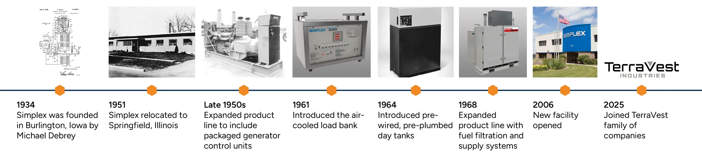 Simplex was founded in 1934 in Burlington, Iowa by Michael Debrey, a Hungarian immigrant. A self-taught inventor, Debrey introduced multiple innovations to the electrical engineering field, including the Automatic Voltage Regulator. Simplex was moved to East Moline, Illinois, where it remained until 1951, when the company relocated to Springfield.